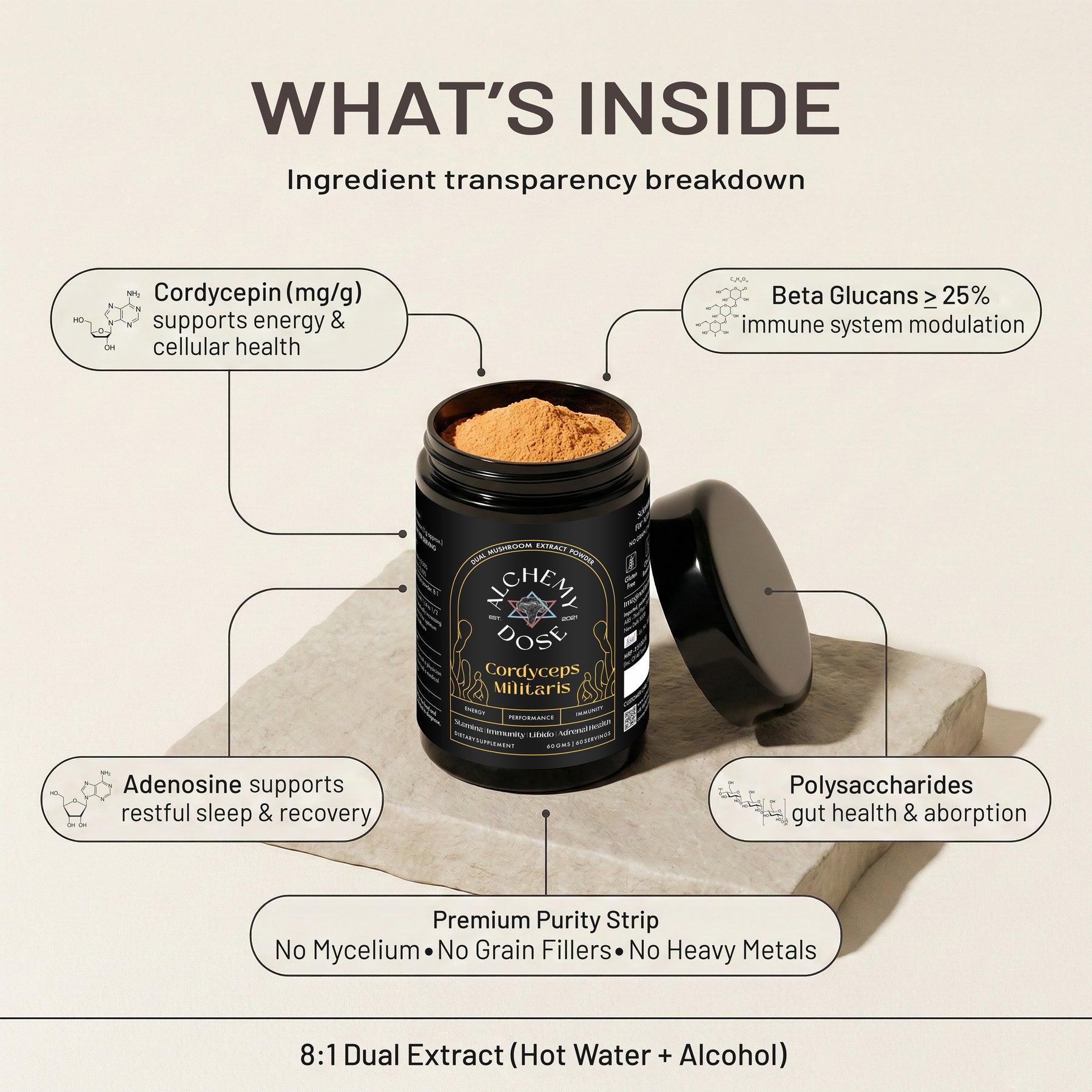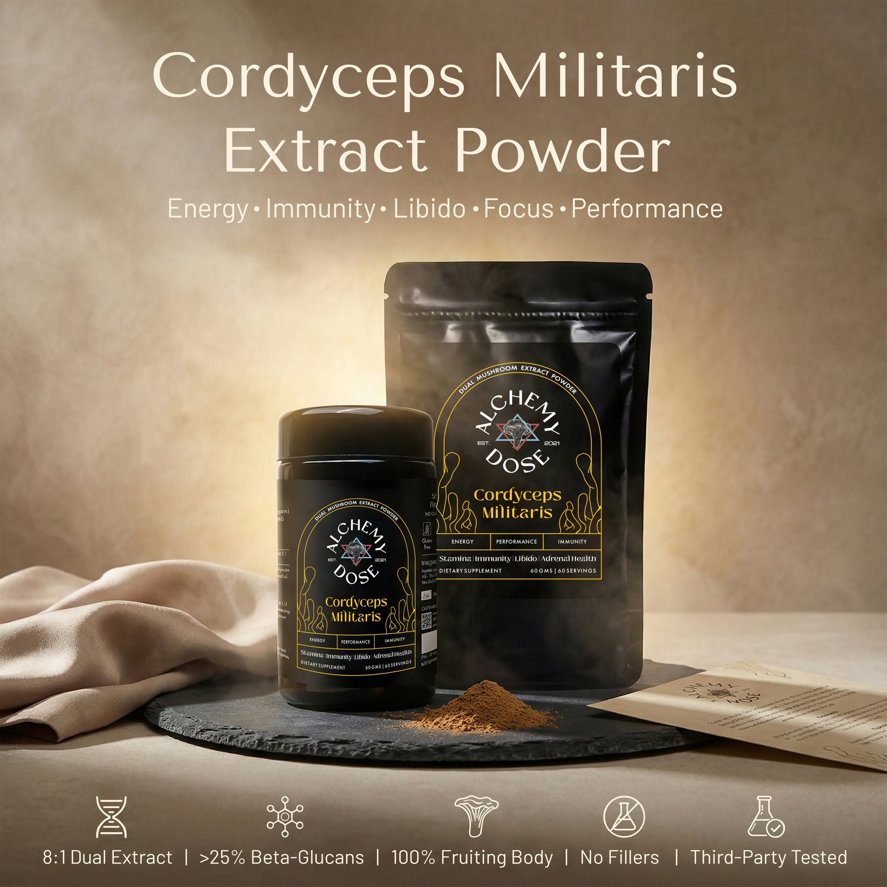 We use only whole dried fruiting bodies of Cordyceps Militaris — never mycelium on grain, starch, or fillers.