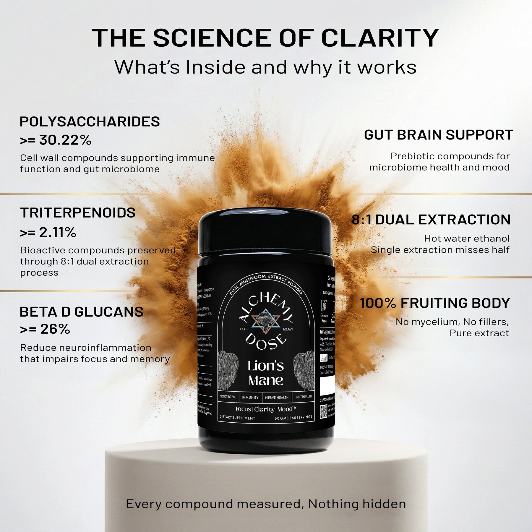 Lion's Mane extract is made through a process called dual extraction, which uses both hot water and alcohol to pull out its bioactive compounds. Hot water extraction draws out beta-glucans, the key water-soluble polysaccharides, while alcohol extraction isolates compounds like hericenones and erinacines, which are among the most studied compounds in functional mushroom research.