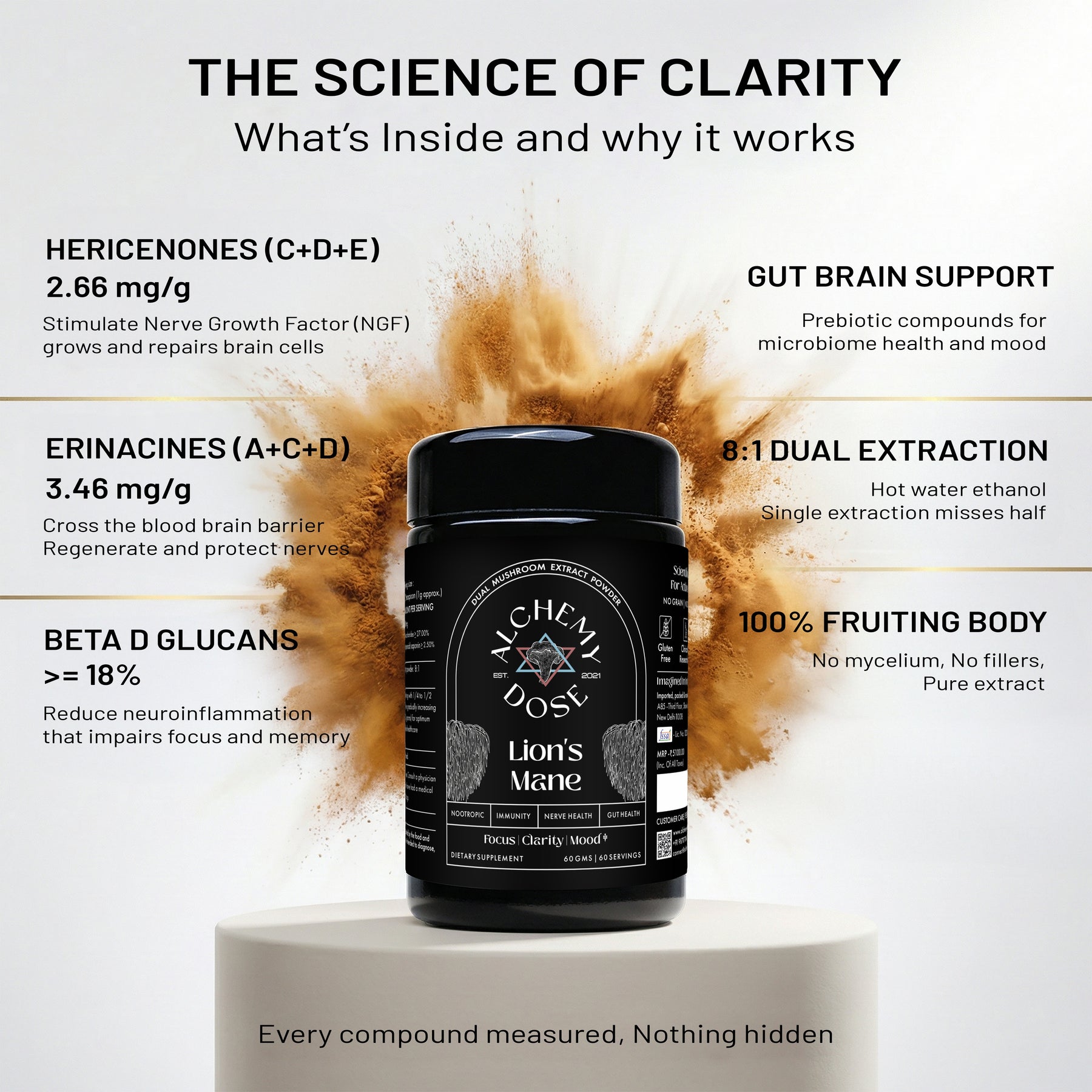 Lion's Mane contains hericenones and erinacines, two bioactive compounds that have been traditionally valued for mental sharpness across Asia for centuries.