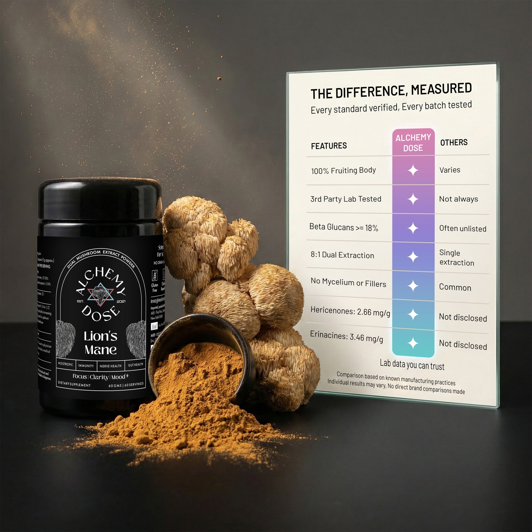 Lion's Mane is unique among functional mushrooms for containing hericenones and erinacines, two compounds found almost exclusively in this species. It is one of the most researched functional mushrooms on PubMed, with over 600 indexed studies examining its bioactive profile. It is also one of the few functional mushrooms traditionally used in both culinary and wellness practices across East Asia for centuries.