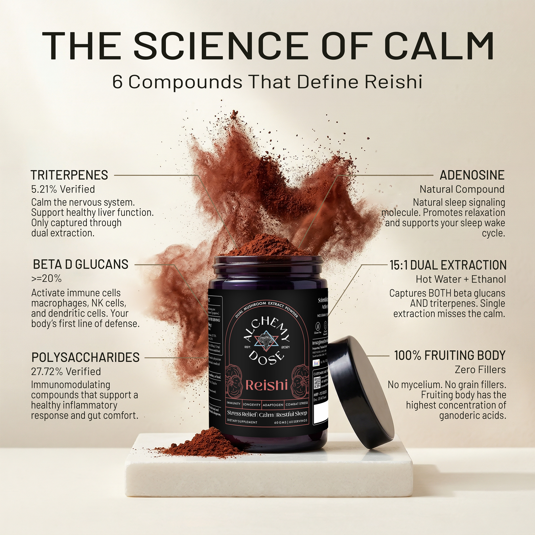 Reishi is naturally rich in beta-glucans, polysaccharides and triterpenes, bioactive compounds traditionally valued as part of a daily wellness routine.