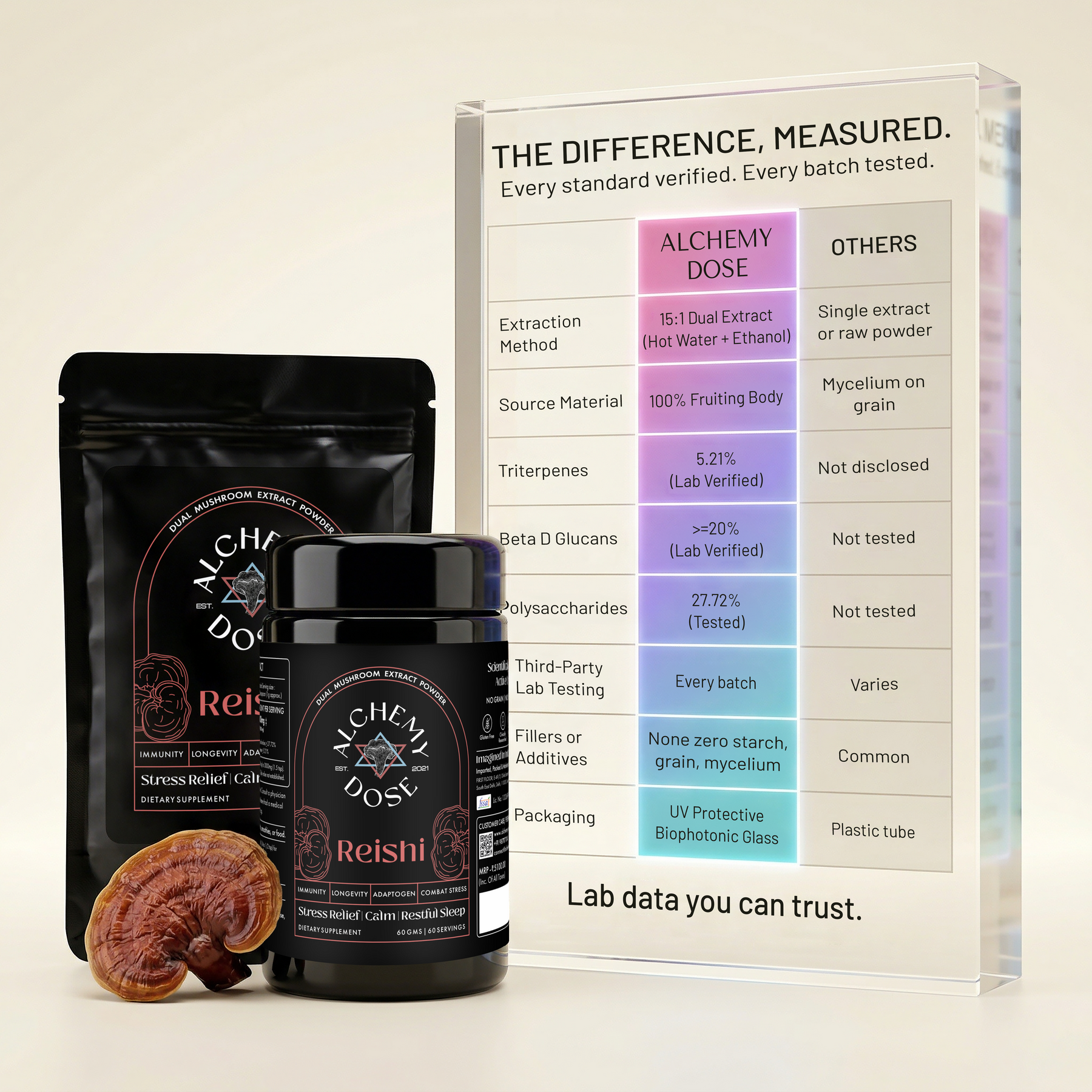 No grain. No starch. No fillers. We skip the myceliated grain and deliver only clean, concentrated mushroom extract.