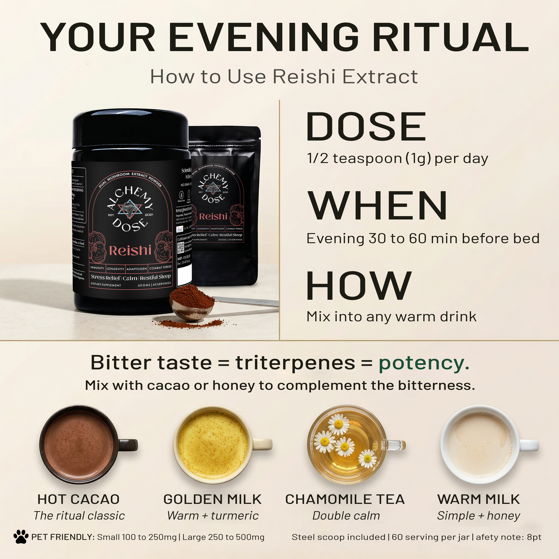 Reishi is traditionally valued for promoting calm and restful relaxation as part of an evening wind-down ritual.